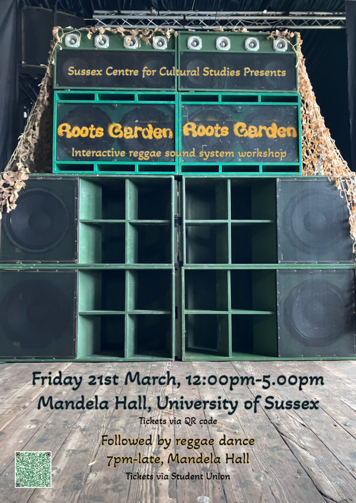 Please join us for an interactive workshop with Roots Garden Reggae Sound System. Jon Morray-Jones, the owner and operator of Roots Garden, and legendary MC Trooper will teach us how to set up and operate a reggae sound system. You will have the chance to select and play records, and to listen to the unique sound of the Roots Garden Reggae Sound System. We will also discuss the history of reggae sound systems in Brighton and the UK.